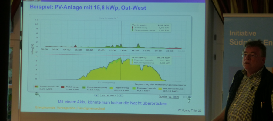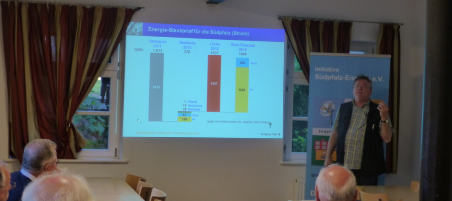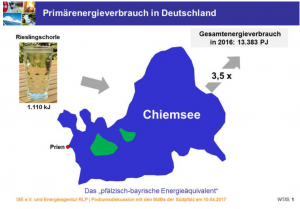 Zunächst erläuterte Wolfgang Thiel, Vorsitzender der Initiative Südpfalz-Energie e.V., in seinem Einführungsvortrag (siehe PDF-Datei) die große Zahl des Primärenergieverbrauchs in heiterer Form mit dem „Pfälzisch-Bayrischen-Energieäquivalent“.