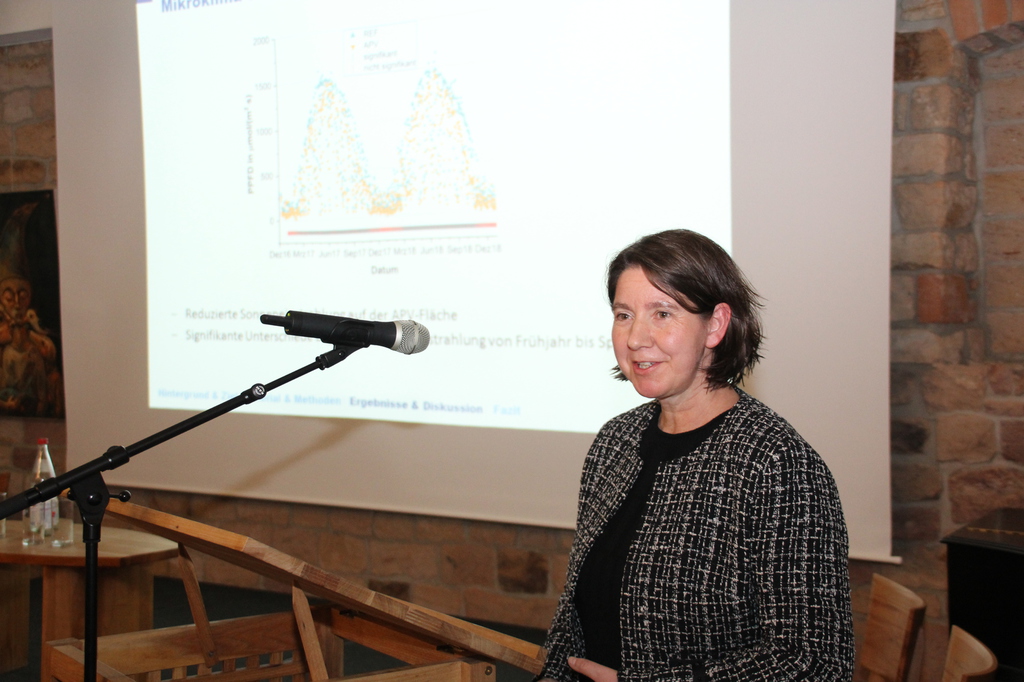 Damit wurde der Übergang zum eigentlichen Thema des Abends eingeläutet: „Photovoltaikanlagen auf Agra-Flächen (AGRO-PV)“ am Bespiel der Pilotanlage Heggelbach bei Stockach am Bodensee. Bevor die beiden Vortragenden Stephan Schindele, technischer Projektleiter des Fraunhofer Instituts für solare Energie (ISE) aus Freiburg und Prof. Petra Högy, landwirtschaftliche Projetleiterin der Uni Hohenheim über sehr viele Details berichteten, wurde das Projekt in einem kurzen Video des Bayrischen Rundfunks vorgestellt.