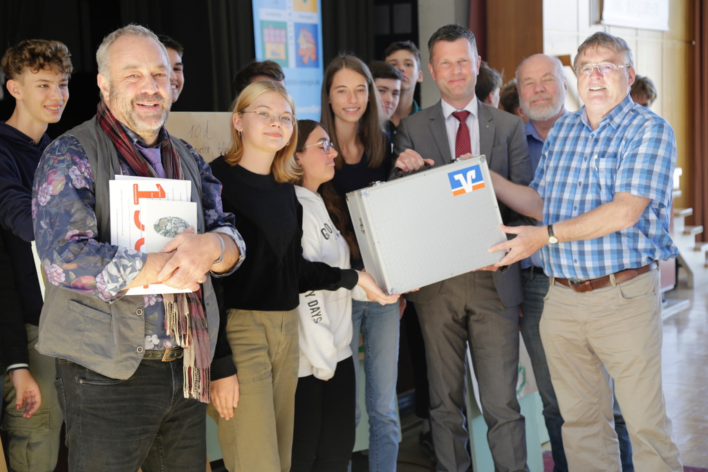 Zum Abschluss überreichten die ISE e.V.-Vertreter und Peter Schehl von der VR-Bank-SÜW einen PV-Koffer, mit dem der Physik-Unterricht bereichert werden soll. Danke an die VR-Bank für die Spende!