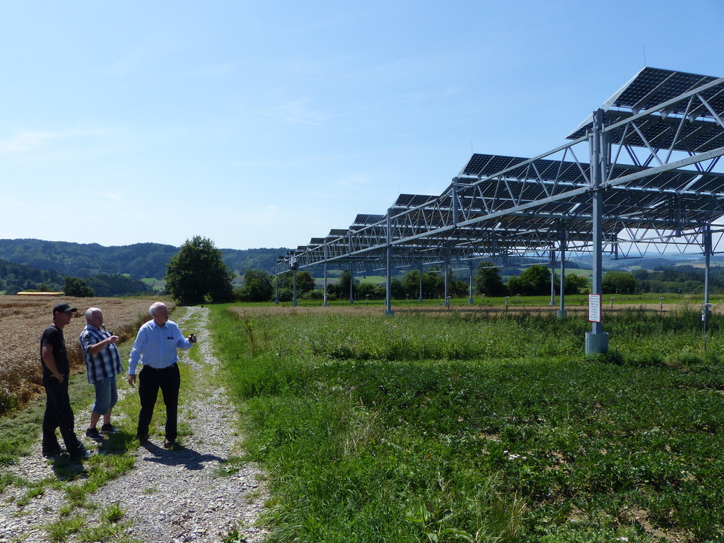Es ist eine Anlage, die durch das „Institut für Solare Energie (ISE)“ der Fraunhofer-Gesellschaft wissenschaftlich geplant/betreut wurde und von der Uni Hohenheim aus landwirtschaftlicher Sicht wissenschaftlich begleitet wird. Bei zwei gleich großen Arealen (mit und ohne PV-Anlage) wurden Weizen, Kleewiese, Kartoffeln und Sellerie angepflanzt. In einem Zeitraum von 3 Jahren wurde die Pflanzen-Entwicklung/Ernte verfolgt und verglichen. Dabei kamen sehr interessante Ergebnisse heraus (siehe Video). Die ISE e.V.-Experten löcherten Florian Reyer, Verantwortlicher der Hofgemeinschaft für den Energiepart, mit Fragen über die Technik und den Betrieb der Anlage sowie den landwirtschaftlichen Aspekten.