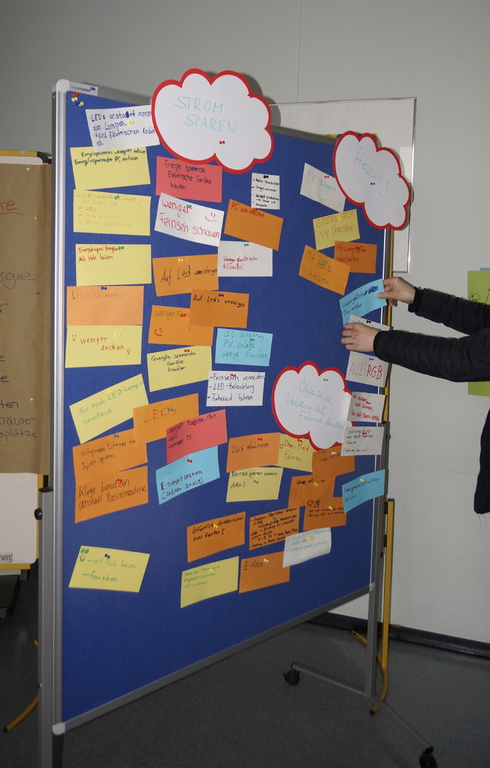 Wolfgang Thiel, Dr. Gerhard Lausterer und Wolfgang Fedderken zeigten sich von den Lernplakaten der Schüler über die verschiedenen Möglichkeiten der Energiegewinnung beeindruckt. Ebenso waren sie vom Interesse der Schülerinnen und Schüler am Thema und ihren Ideen zum Strom sparen begeistert. Die Vorschläge der Lernenden waren z.B. der bewusste Kauf energiesparsamer technischer Geräte und ihre sparsame Benutzung, LED-Lampen, mehr Handarbeit in der Produktion und weniger Fernsehen und „zocken“. Zum sparsamen Heizen sammelten sie z.B. Temperatur drosseln, Stoßlüftung, Ventile abschalten beim Öffnen der Fenster, eine Photovoltaikanlage installieren oder mit Holz heizen. Zum Energie sparen im Verkehr wurden die Überlegungen genannt, häufiger das Fahrrad anstelle des Autos zu nutzen, Fahrgemeinschaften zu bilden, den öffentlichen Nahverkehr zu nutzen oder verstärkt auf E-Autos umzusteigen.