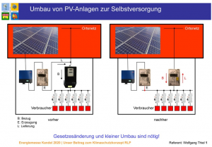„Photovoltaik-Anlagen, die demnächst aus der EEG-Förderung fallen, können gut und gern weitere 20 Jahre lang Strom produzieren. Es liegt nahe, dass sich die Besitzer nun einen Batteriespeicher zulegen, um einen möglichst großen Teil des erzeugten Stroms selbst zu verbrauchen. Dadurch vermindert sich der Bedarf an Netzstrom, der derzeit gut 30 Cent pro Kilowattstunde für Privathaushalte kostet. Wenn auch nach dem Laden des Elektrofahrzeugs mit eigenem Strom ein Überschuss verbleibt, könnte der Solarstrom diesen – für eine geringere Vergütung als zuvor – ins Netz einspeisen“, so Christfried Lenz von der Bürgerenergie Altmark im pv-magazine vom 16.04.2020. Voraussetzung ist eine Novellierung des EEG und ein kleiner Umbau (siehe Bild).