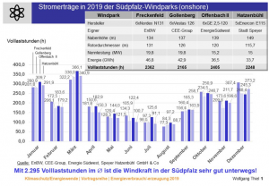 Die Stammtischteilnehmer waren sehr überrascht, als Thiel die Jahreserträge von den Windparks Freckenfeld, Gollenberg, Offenbach II und Hatzenbühl in der Region Südpfalz präsentierte: Mit zusammen 160 Mio kWh konnten die vier Windparks fast 40.000 Haushalte mit Strom im Jahr 2019 versorgen. Besonders bemerkenswert ist die Tatsache, dass die genannten Windkraftanlagen mit durchschnittlich fast 2.300 Volllaststunden einen sehr hohen Wert für Süddeutschland erreicht haben. Mit den Volllaststunden wird der Jahresnutzungsgrad einer Anlage ermittelt, indem die Volllaststunden an den 8760h/a (kein Schaltjahr) gemessen werden. D.h. mit 2.300 Volllaststunden wird ein Jahresnutzungsgrad von 26,2% erreicht. Diese Zahlen werden die Windkraftgegner der Region wohl sehr nachdenklich machen, weil sie solche Erträge bisher angezweifelt haben.