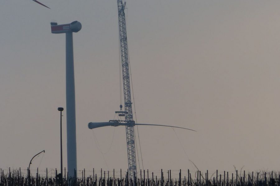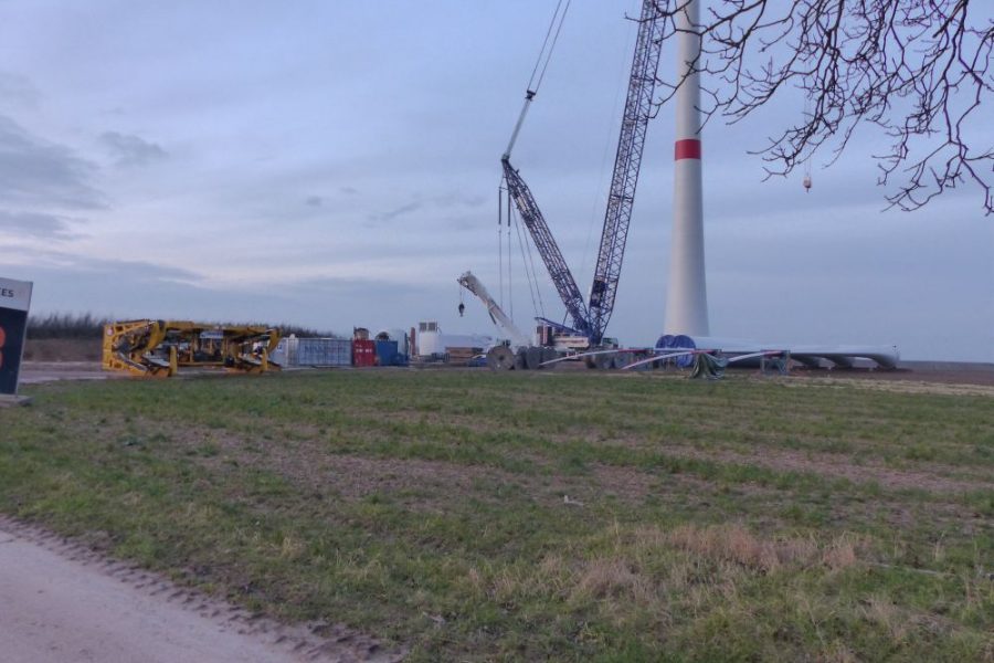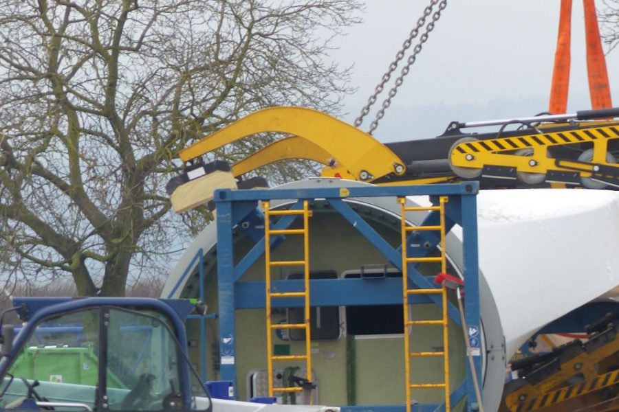 Heute sollten die Rotorblätter hochgezogen werden, jedoch das Wetter spielte nicht mit, zu viel Wind. Hoffentlich gibt’s nächste Woche weniger Wind, denn die Rotorblätter haben eine große Angriffsfläche. Übrigens: Ein Rotorblatt wiegt ca. 15t.