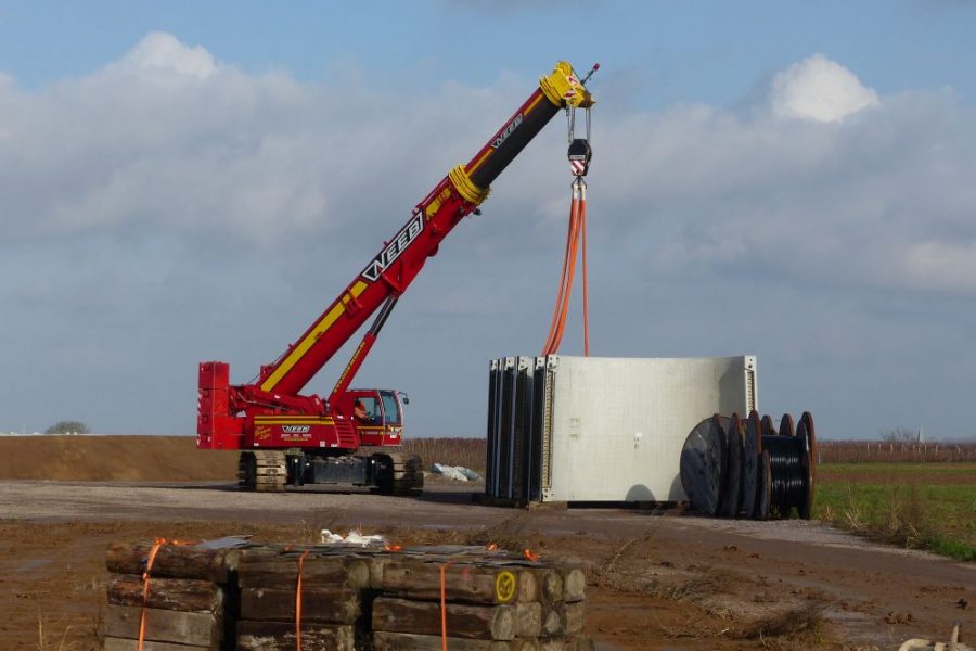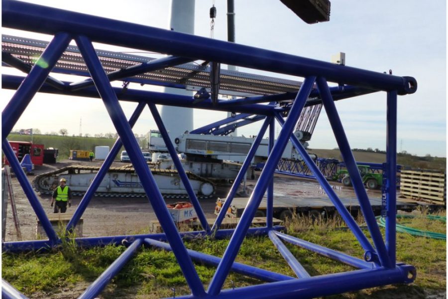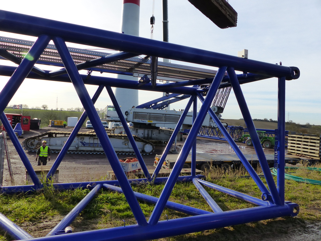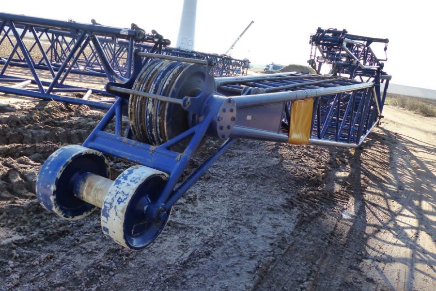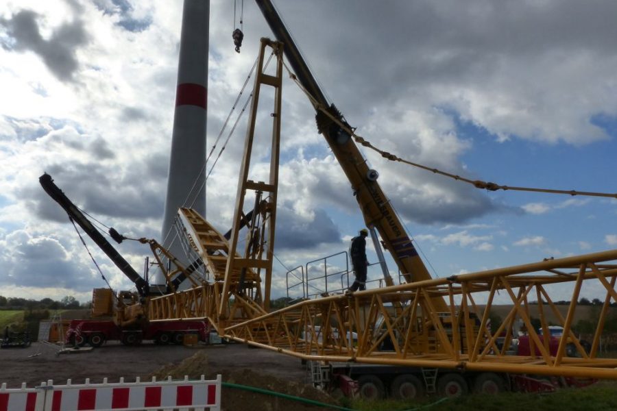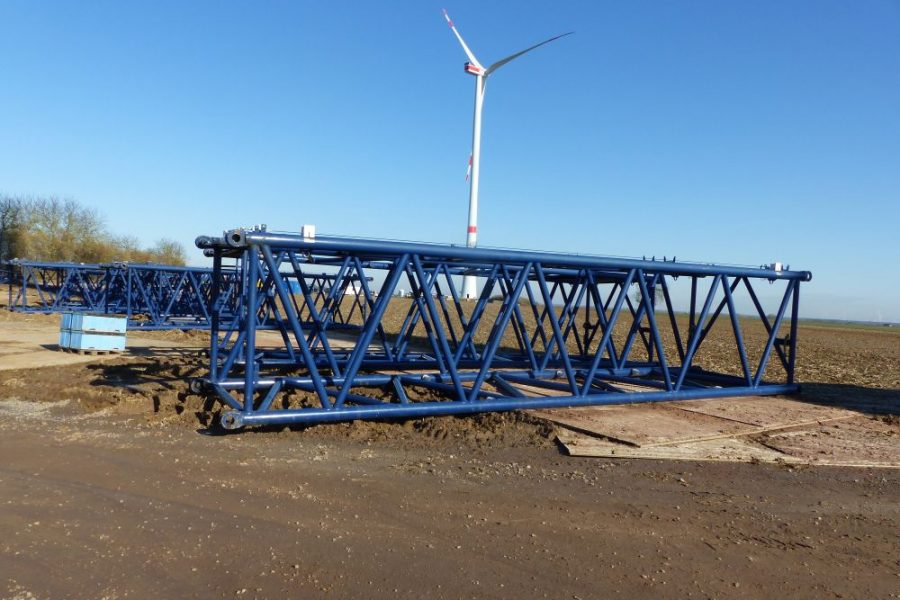 – Beim Windrad FRF06 wird der große Kran aufgebaut für die Montage der beiden 25 m-Stahlrohre, die Gondel (das Maschinenhaus) und die Rotorblätter. Die Dimensionen dieses Krans sind riesig: Zum Transport für eine Kranraupe wurde ein Tieflader benötigt. Für den Zusammenbau dieses Krans werden zwei Autokrane benötigt!