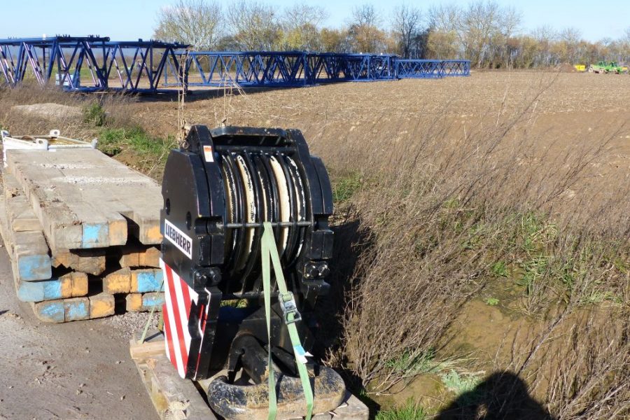 Damit die Montage der oberen Windradteile schneller vorangeht, wurde ein 2. großer Kran auf die Baustelle gebracht (beim FRF03). Damit wird die Montagegeschwindigkeit verdoppelt. Noch liegt er wegen zu starkem Wind am Boden.