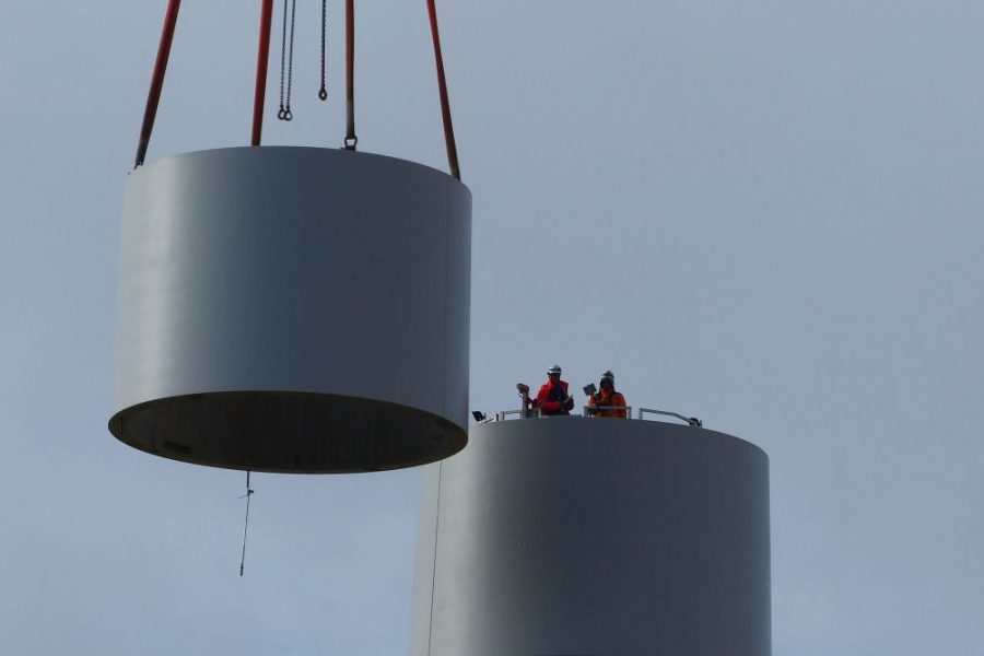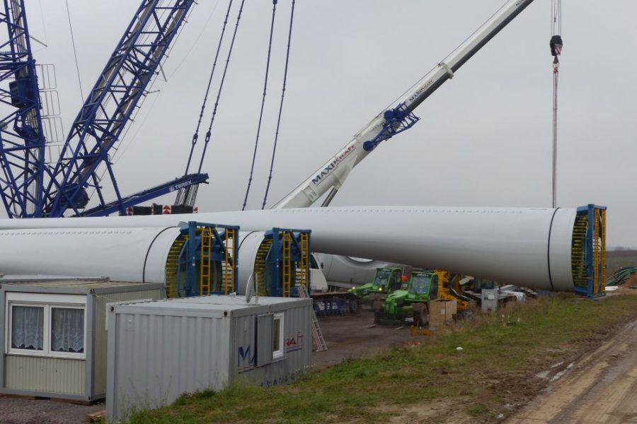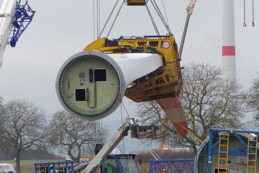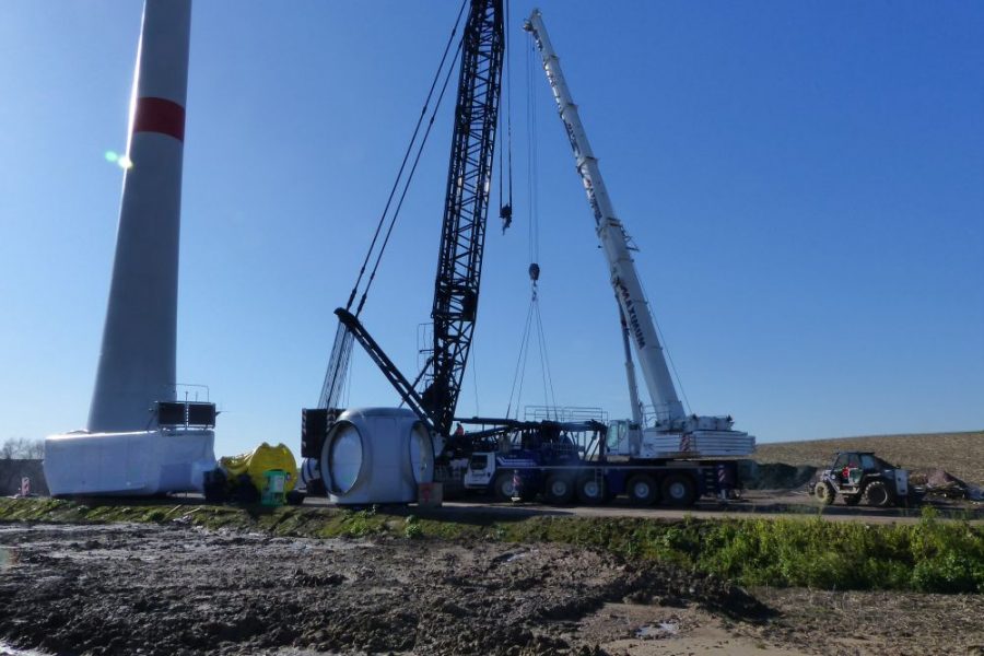 Beim Windrad FRF03 werden bereits die Turmsegmente montiert.