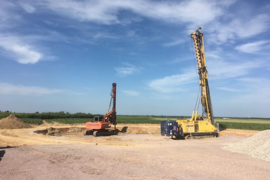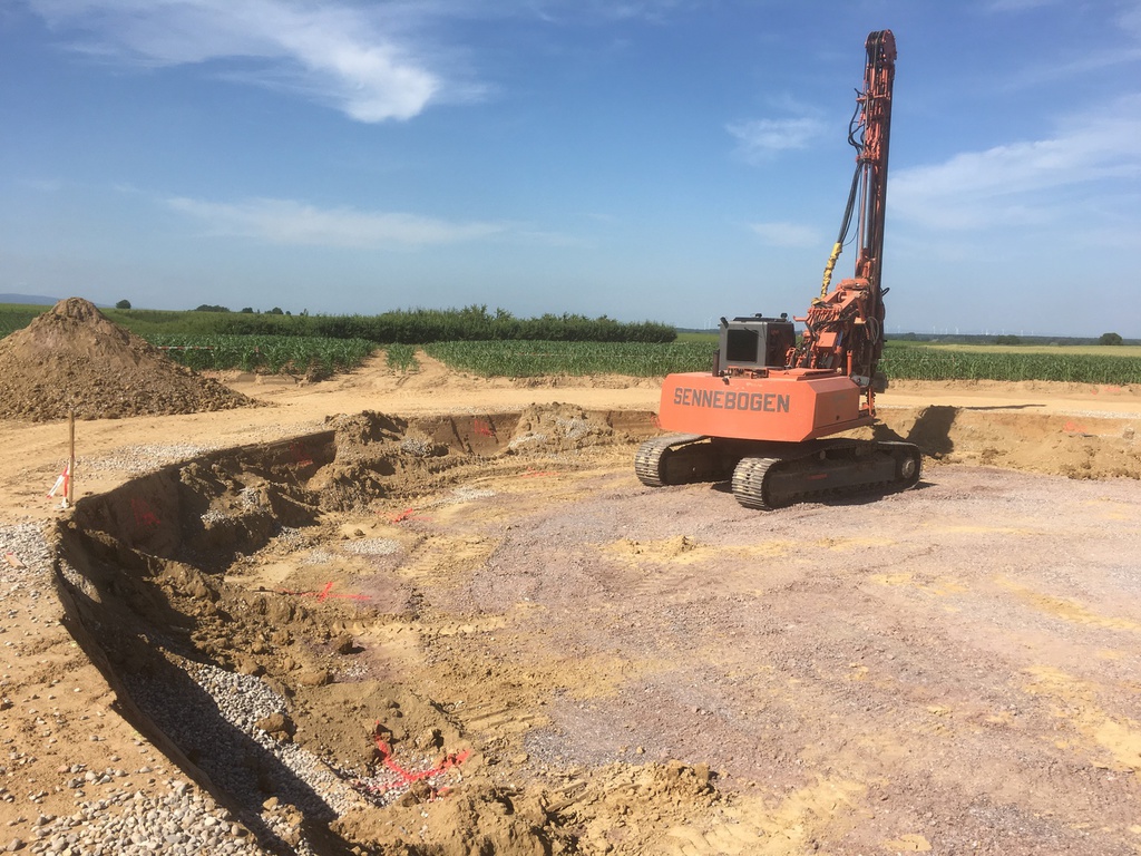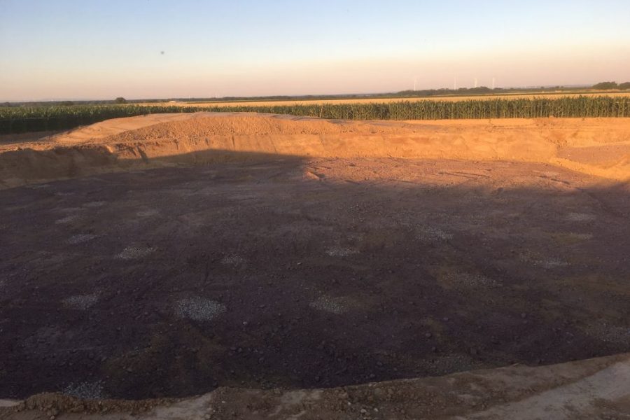 Doch weit gefehlt: Bei den Bohrlöchern handelt es sich um sogenannte „Kiesstopfsäulen“. Bei dem Fundament einer WEA werden ca. 15 Löcher mit 9m Tiefe in die Erde gebohrt und mit Rheinkies unter hohem Druck „ausgestopft“. Damit wird erreicht, dass die Fundamentgründung, also der Boden unter dem Fundament, stabiler wird.