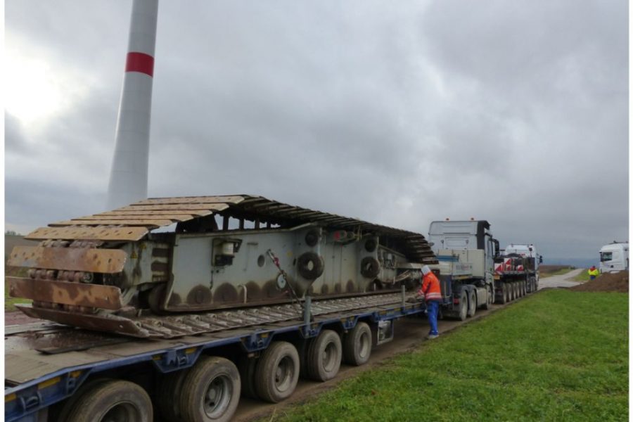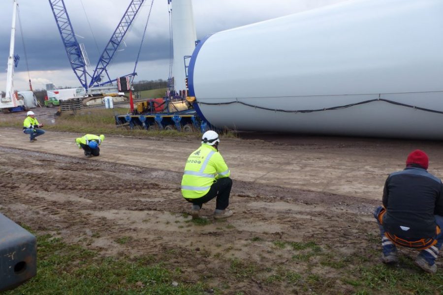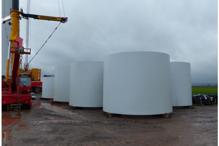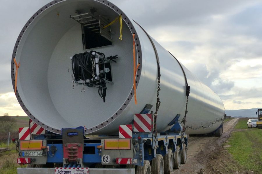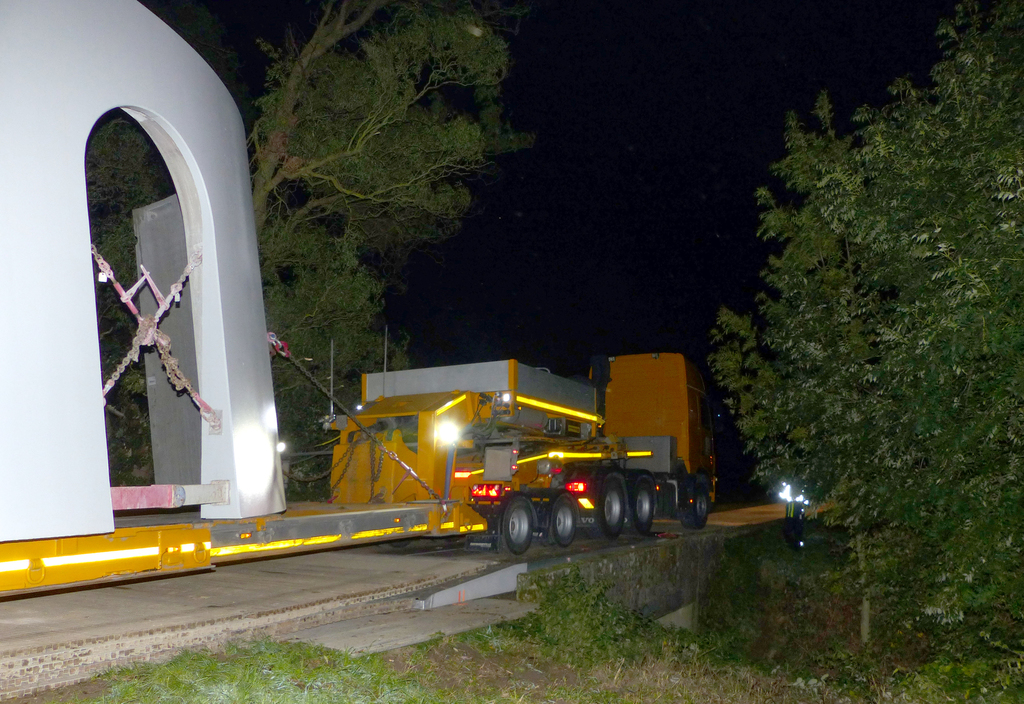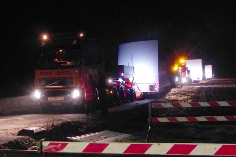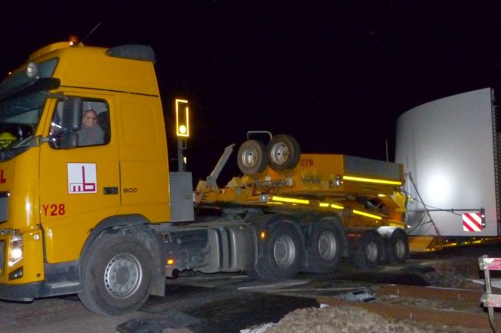 Der Schwerlasttransport geht Nacht für Nacht weiter. Die Turmsegmente für das Windrad FRF03 sind schon geliefert.