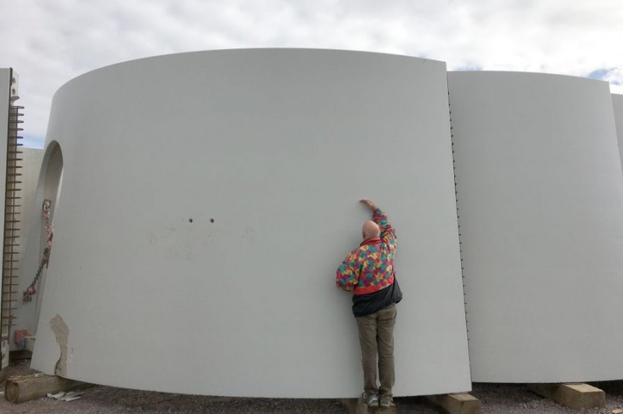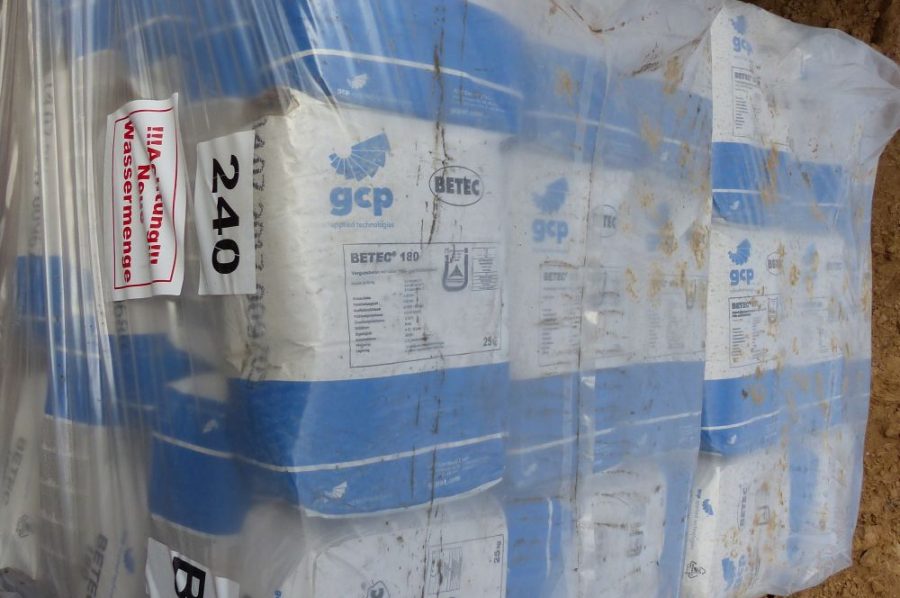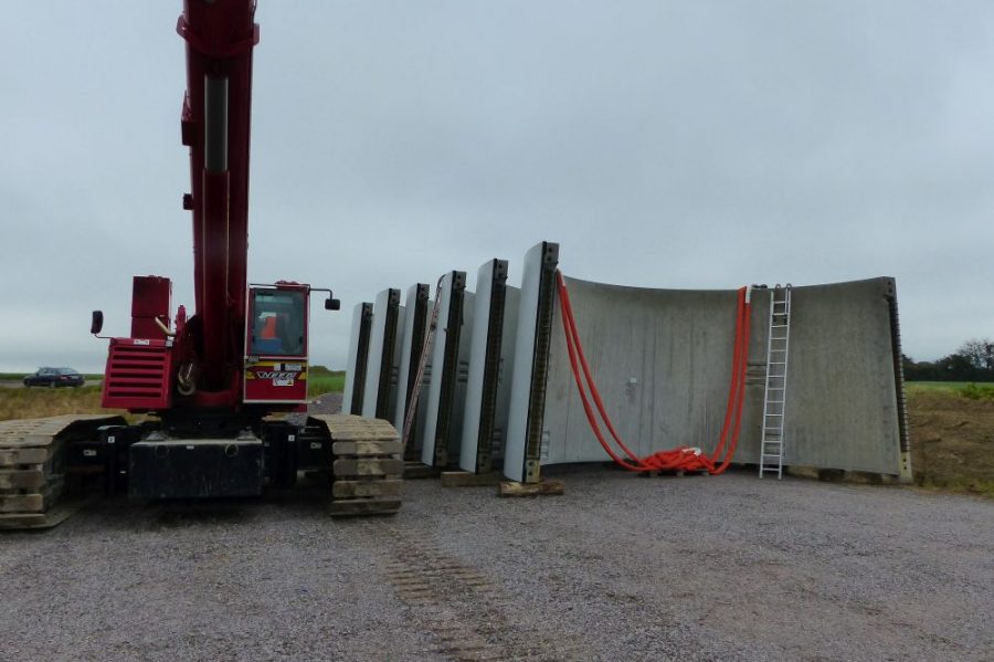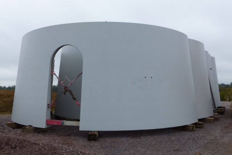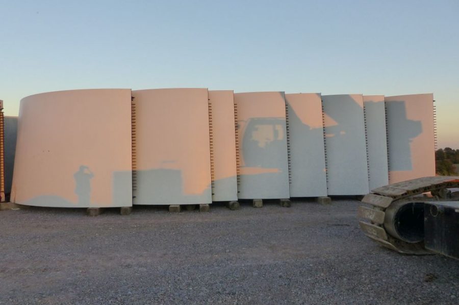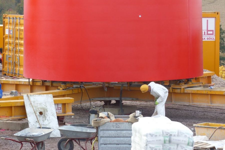 Zunächst werden jedoch die Halbschalen zu Turmsegmenten am Boden, auf Montageschienen, miteinander verbunden. Dazu sind die Säcke mit Vergussbeton schon geliefert. Die Beton-Segmente der oberen Ebenen (Betonrohre) sind auch schon auf der Baustelle und werden direkt auf die zusammengesetzten Segmente montiert. Zwischenteile für den Innenausbau sind bereits angliefert.