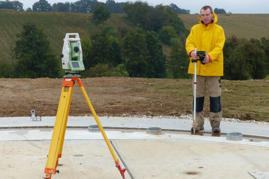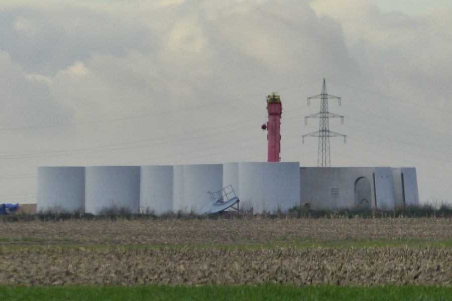 Am Nachmittag im Hellen war das Bild beim Windrad FRF06 dann doch sehr nüchtern, denn da standen recht unspektakulär sechs Halbschalen des Hybridturms aneinandergereiht alleine auf weiter Flur. Stimmt nicht, ein Vermesser nahm Messpunkte auf, damit die Mannschaft für den Turmbau eine ordentliche Basis bekommt.