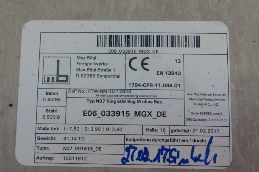 In der ersten Woche, in der die Schwerlasttransporte fahren, sind 23 Halbschalen angeliefert worden. Wie schon bei der Herstellung der Fundamente, kommen auch jetzt viele technisch Interessierte auf die Baustelle, um Details zu entdecken. Wie groß und wie schwer sind die Halbschalen? Wie werden diese miteinander verbunden? Die Höhe wurde mit der Körpergröße abgeschätzt. Doch ein Blick auf das individuelle Typenschild eines jeden Turmteils gibt Aufschluss auf die technischen Daten (siehe Bilder):