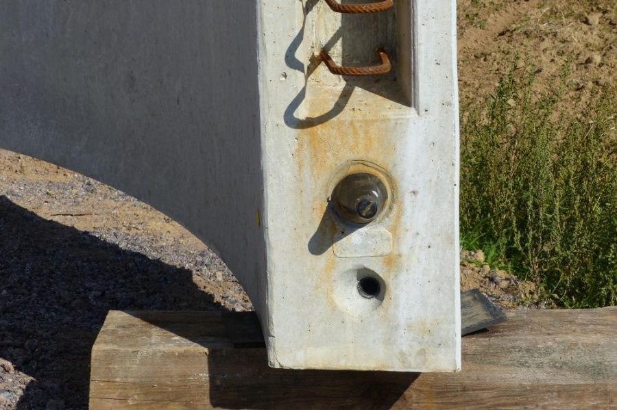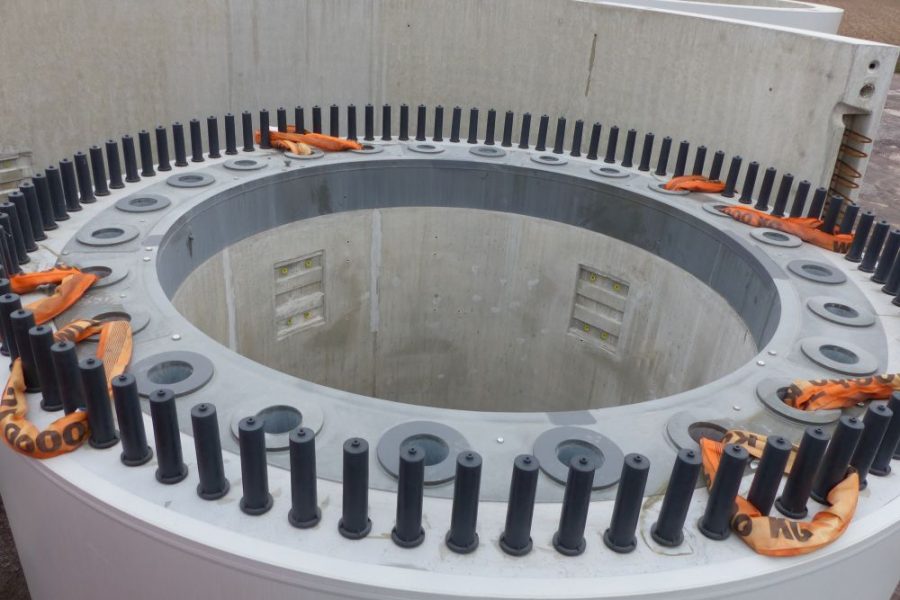 Die beiden Halbschalen werden am Boden auf Montageschienen zu einem Segment zusammenfefügt. Zunächst werden sie zusammengesteckt, dann verschraubt und zum Schluss mit Beton verbunden. Der „Einfüllstutzen“ für den Beton ist auf einem Bild gut erkennbar.