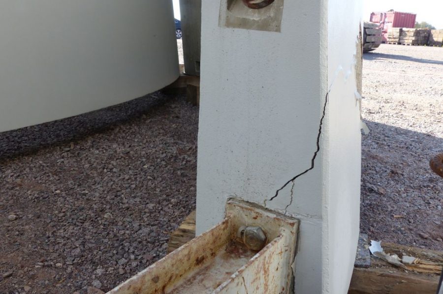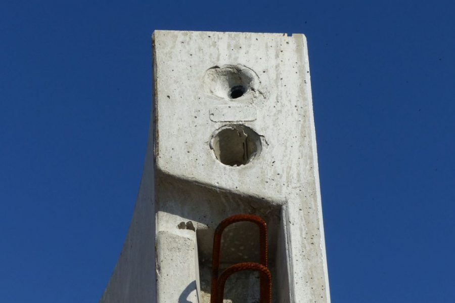 Genau dieses „Marmeladen-Gesetz“ hat beim Abladevorgang einer Halbschale vom Schwerlasttransporter zugeschlagen: diese Halbschale traf eine bereits gelagerte Halbschale, die am empfindlichsten ist, das Turmteil mit der Eingangstür (siehe Bild). Das geschädigte Teil wird sicher ausgetauscht. Die Montageversicherung wird’s wohl zahlen.