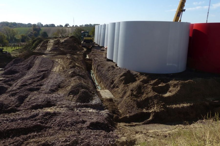 Auf der Baustelle selbst hat sich beim ersten Blick nicht viel getan. Wenn man aber genau hinschaut, ist zu erkennen, dass die Verkabelung zwischen den Windrädern fast abgeschlossen ist. Auf dem Bild vom FRF 02 sind die schwarzen 20 kV-Kabel und das grüne Leerrohr (für die Steuerleitungen, LWL?) zu erkennen. Im „Kabelkeller“ der Windräder werden dann die Leitungen miteinander verbunden. Als nächster Schritt wird die Verkabelung von dem Windpark zur Umspannstation in Kandel in Angriff genommen.