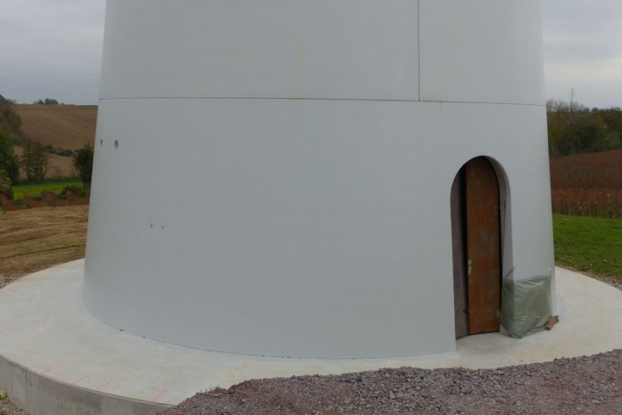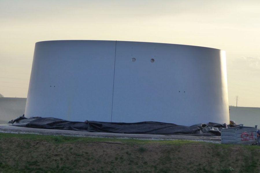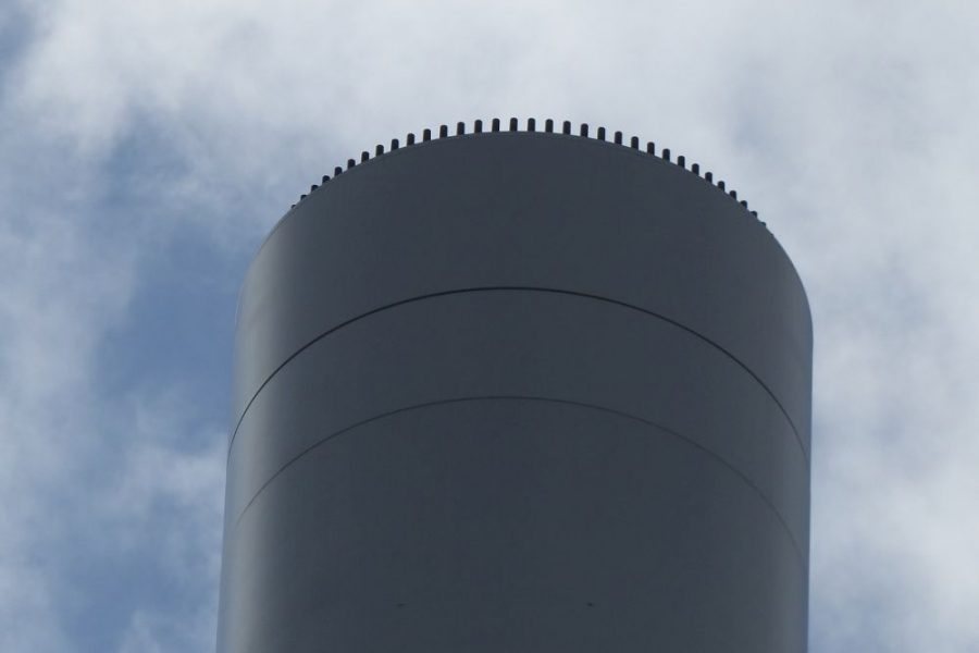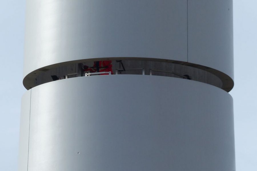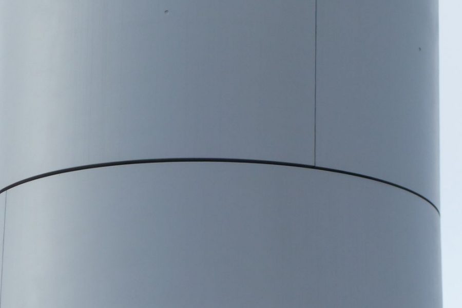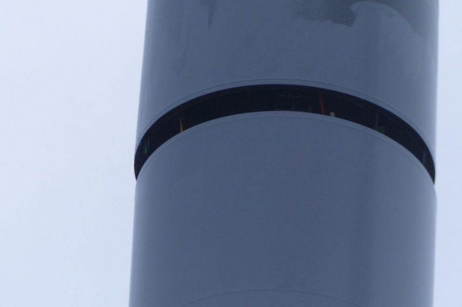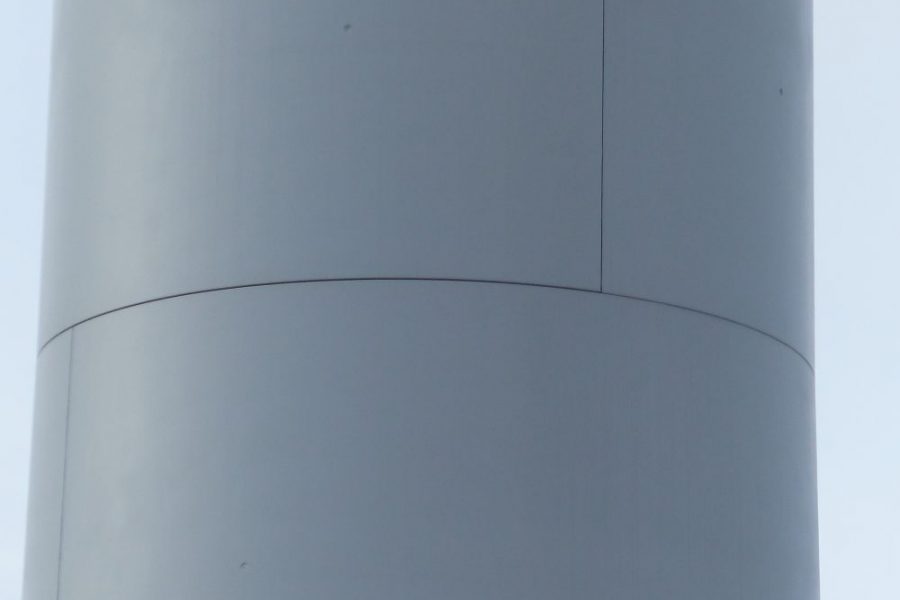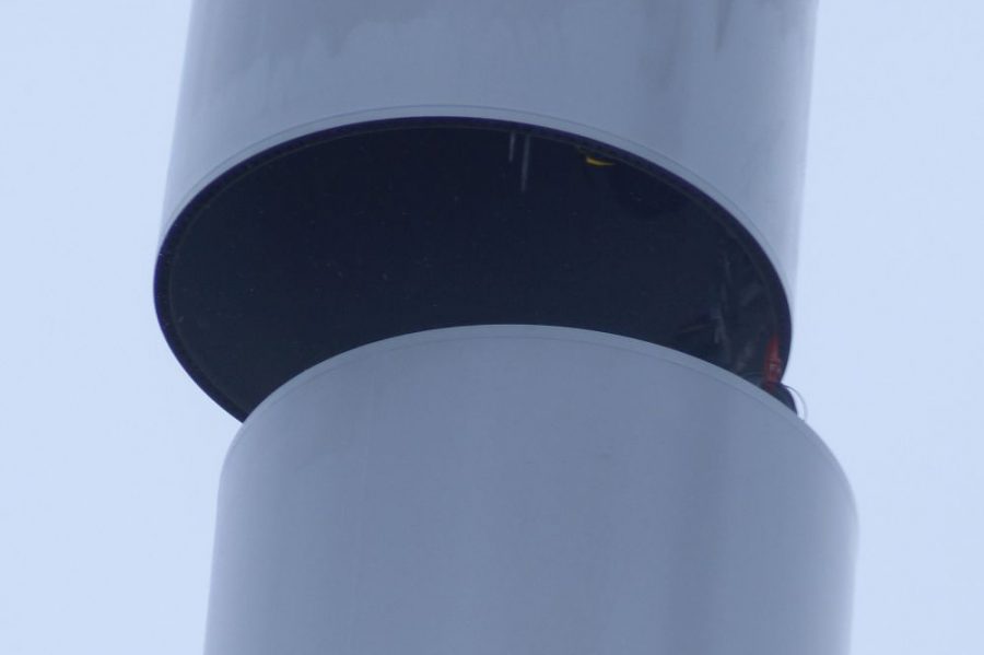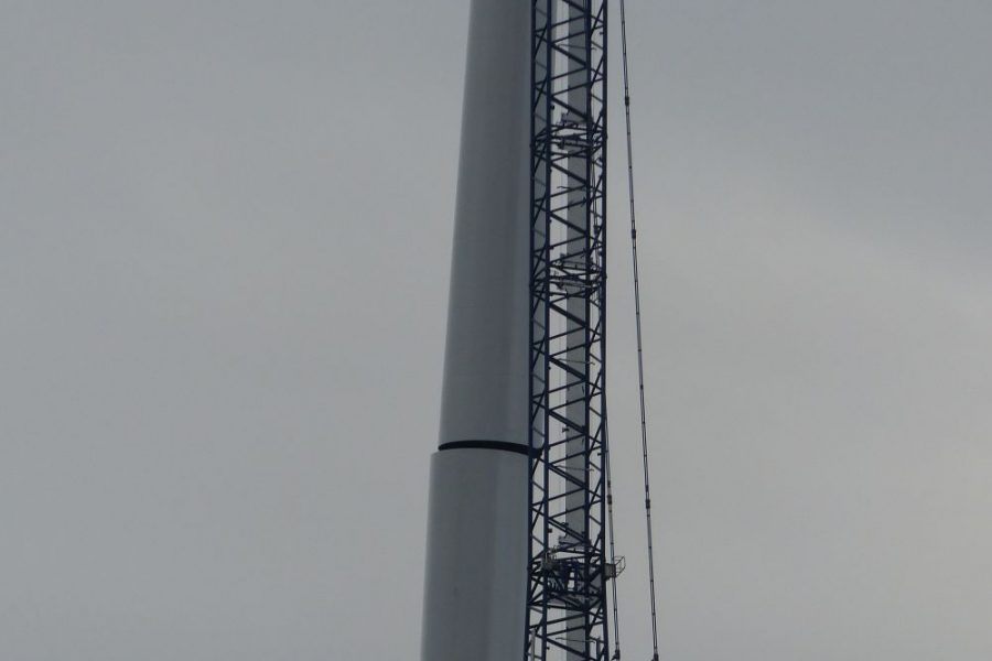 Die beiden Stahlrohre, der letzte Teil des Hybridturms vom Windrad FRF06, sind montiert worden. Jetzt ist der Turm schon von Weitem zu sehen.