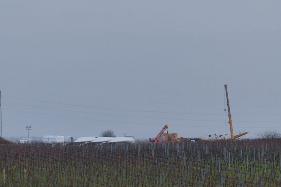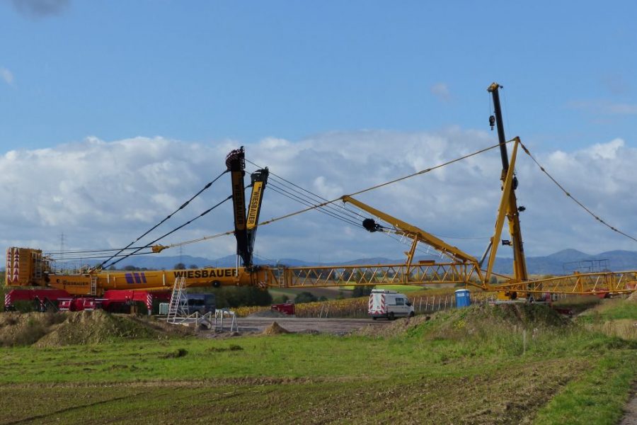 Es war eine richtige Entscheidung der Bauleitung, den großen Kran beim FRF06 rechtzeitig umzulegen, denn die Realität hat die Windvorhersage bestätigt. Orkanartige Böen, die über die Südpfalz fegten, hätten den großen Kran in schwere Bedrängnis gebracht. Dass ist auch der Grund für die momentane Montageverzögerung auf der Baustelle.