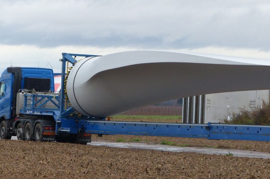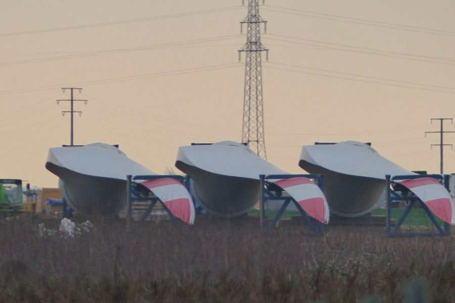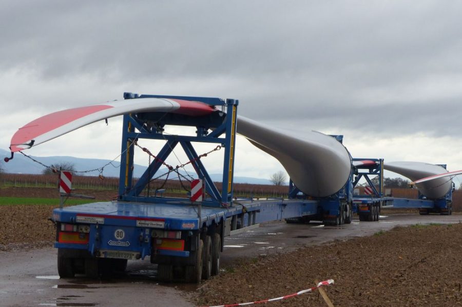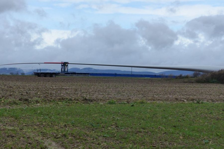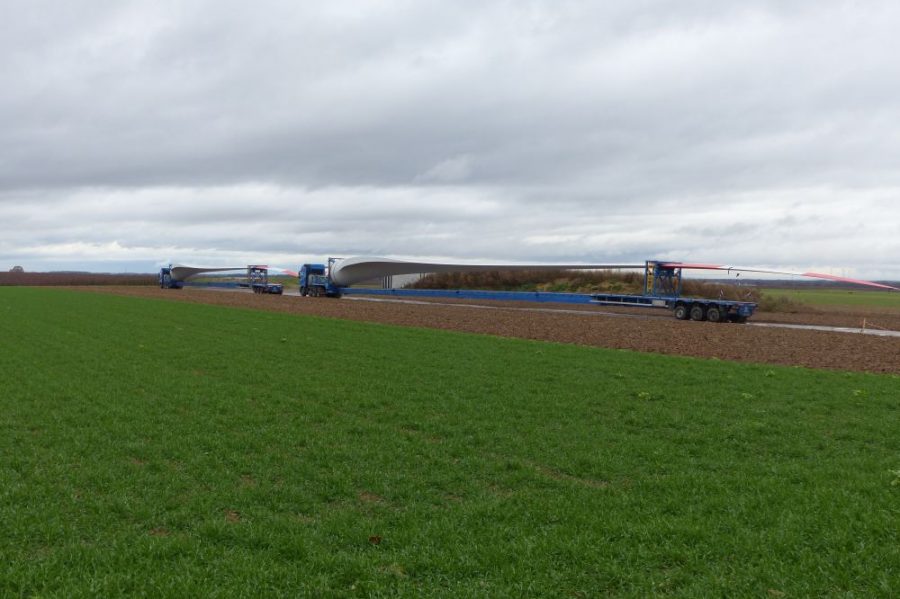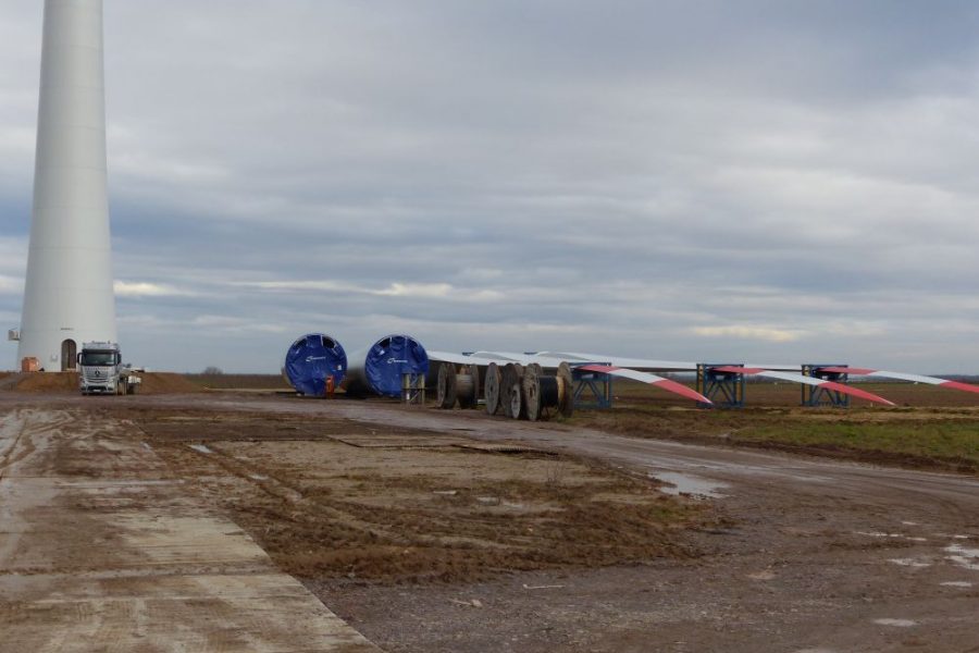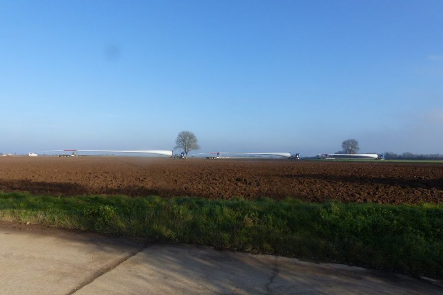Da die Schwerlasttransporter für den Transport der weiteren Windräder gebraucht werden, wurden die Rotorblätter kurzer Hand abgeladen und zwischengelagert.