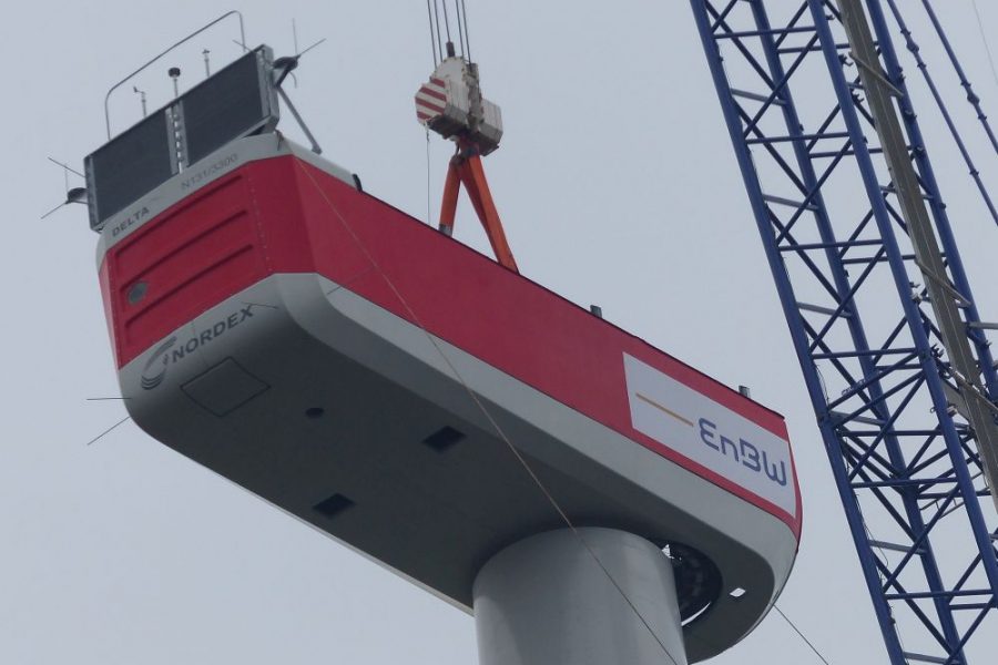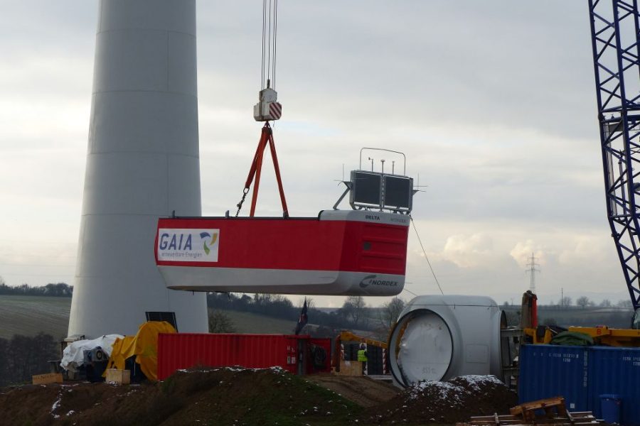 Recht unspektakulär wurde das Maschinenhaus aufgesetzt: Einfach angehängt, hochgezogen, positioniert, abgesetzt und mit Schlagschrauber festgeschraubt. So einfach geht das, und das Ganze in mehr als 130 m Höhe. Auch der Antriebsstrang ist montiert. Sehr gute Arbeit der Monteure und Kranfahrer von Nordex und seinen beauftragten Firmen. Natürlich muss man hier auch Martin Lohmann, den Site-Manager nennen. In der Pfalz würde man die Aufgabe einfach als Bauleiter bezeichnen.
