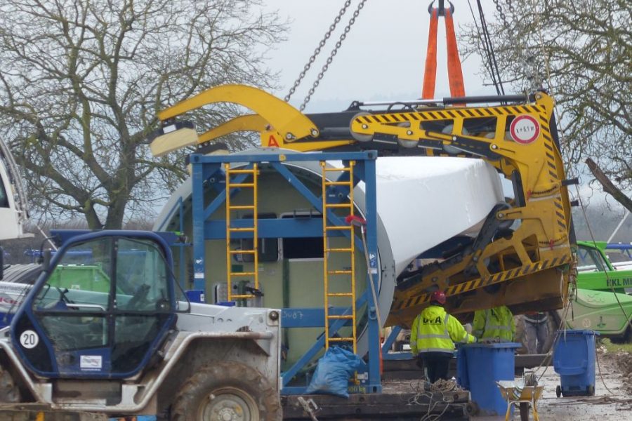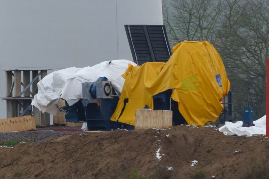 Das Maschinenhaus mit Nabe, die 2 Stahlrohre und Rotorblätter für das Windrad FRF03 warten auf die Montage.
