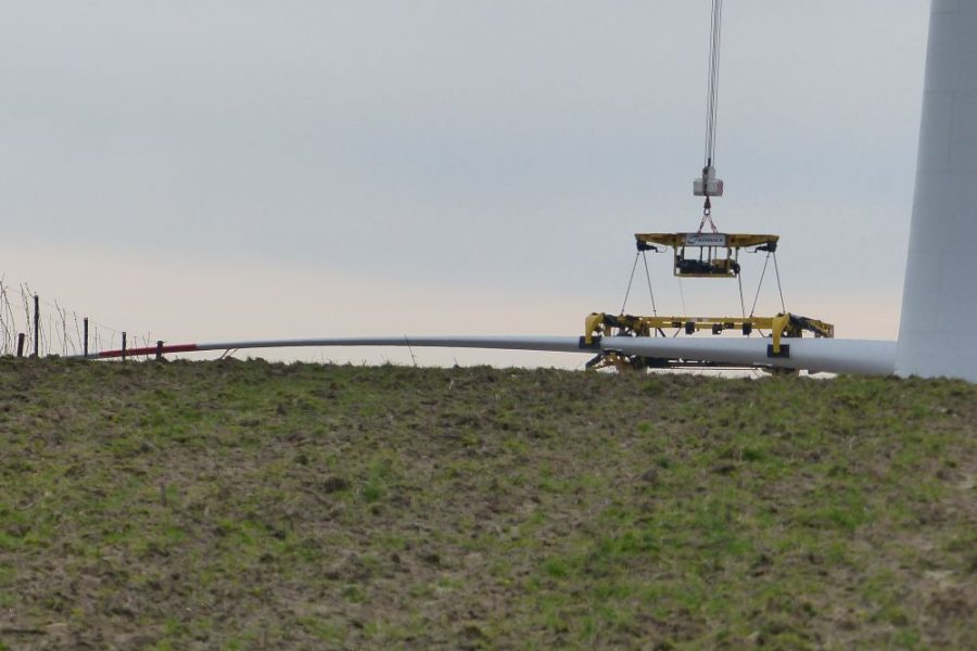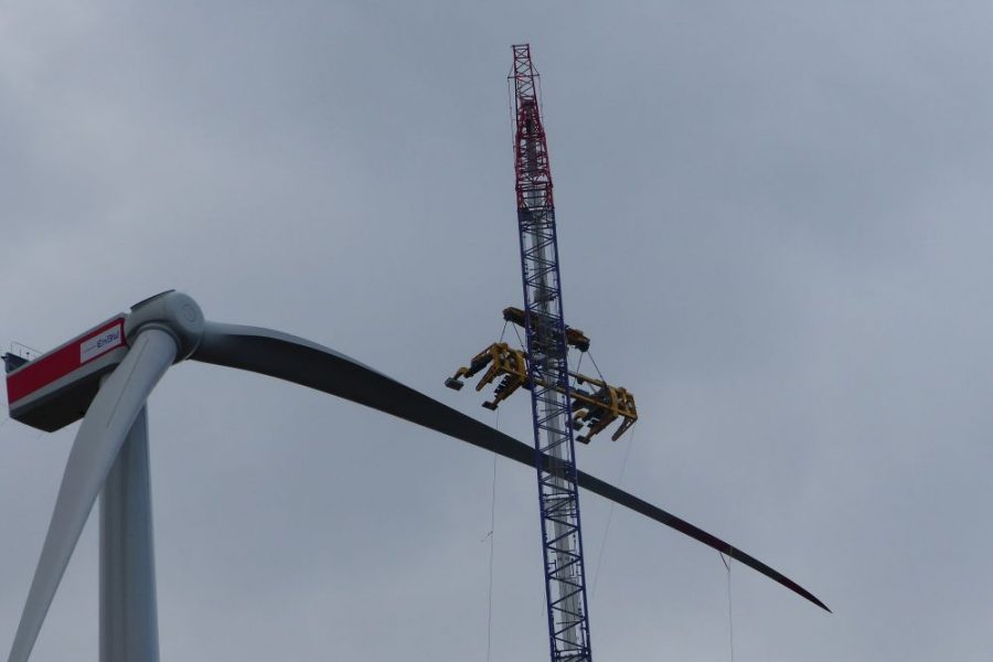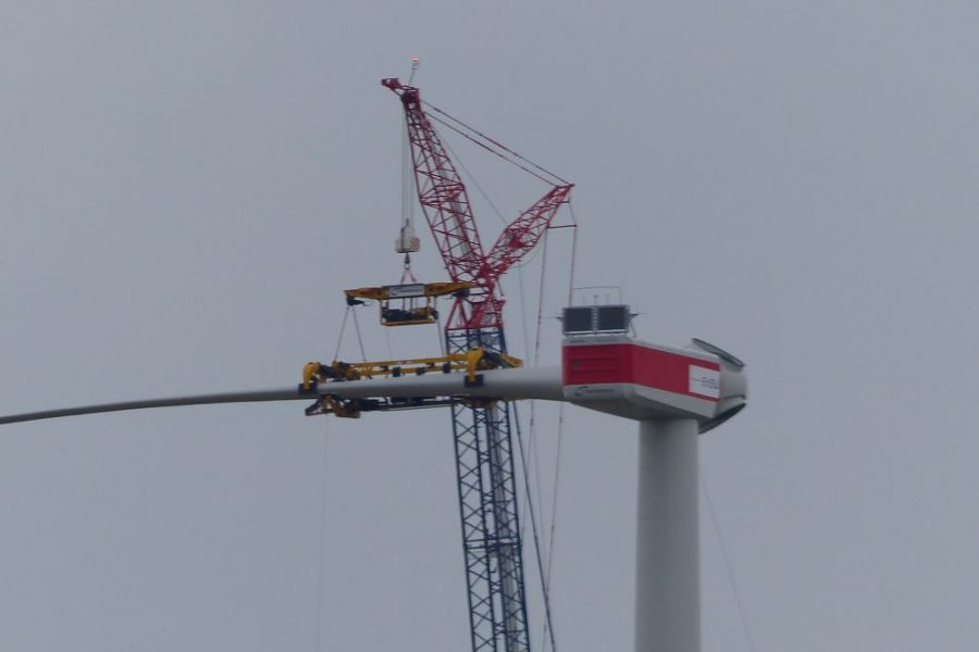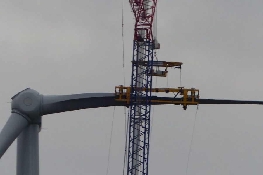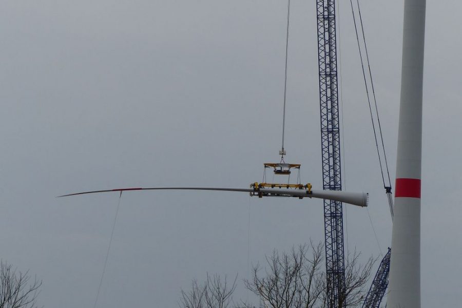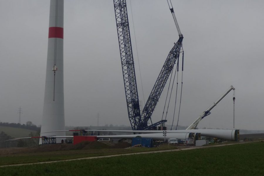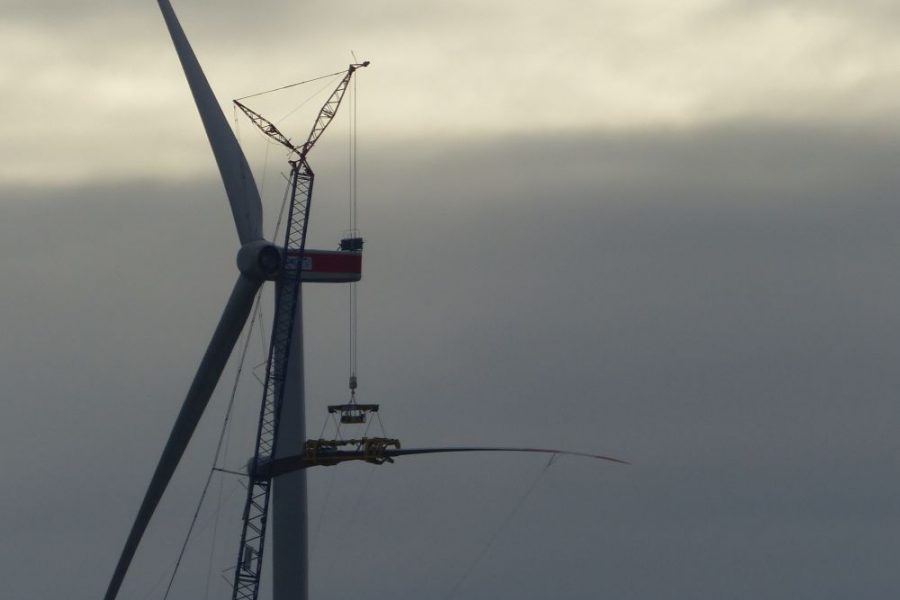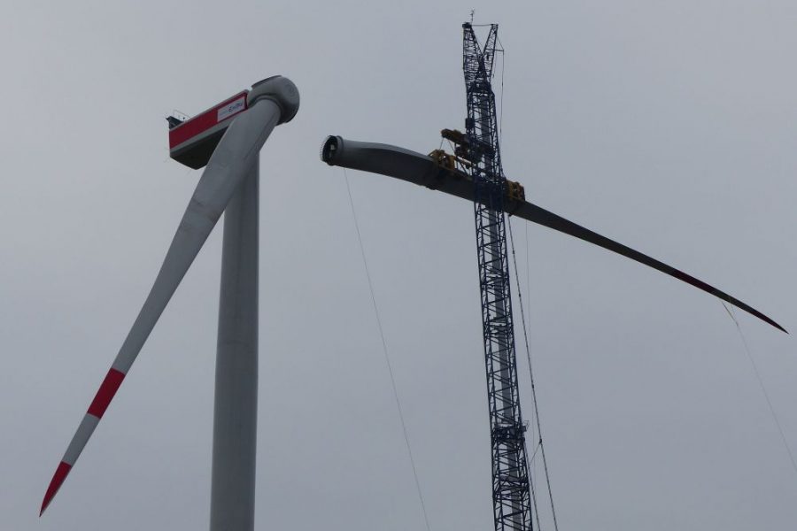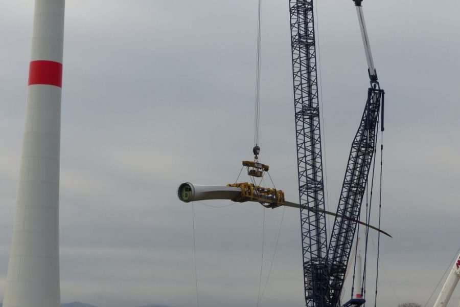 07.12.2017 Das erste Rotorblatt des Windparks ist montiert