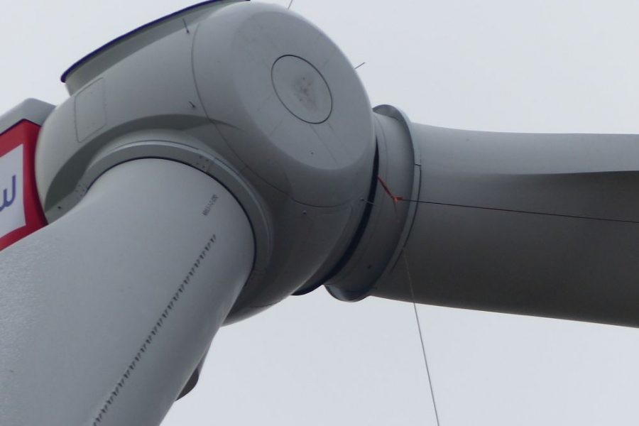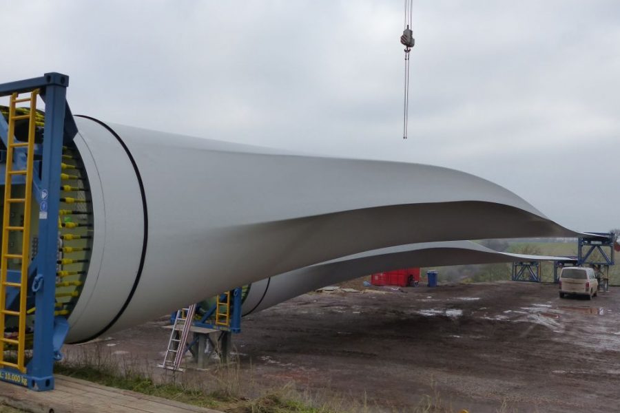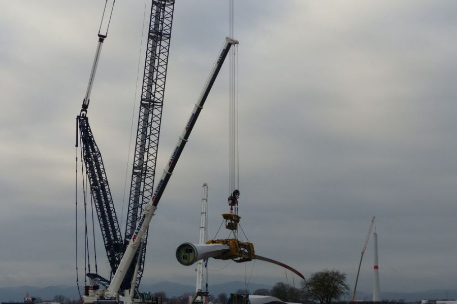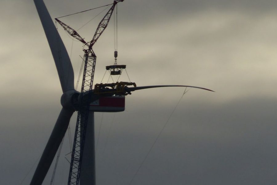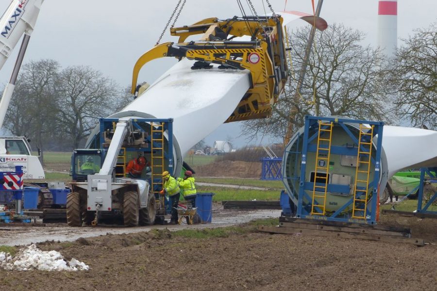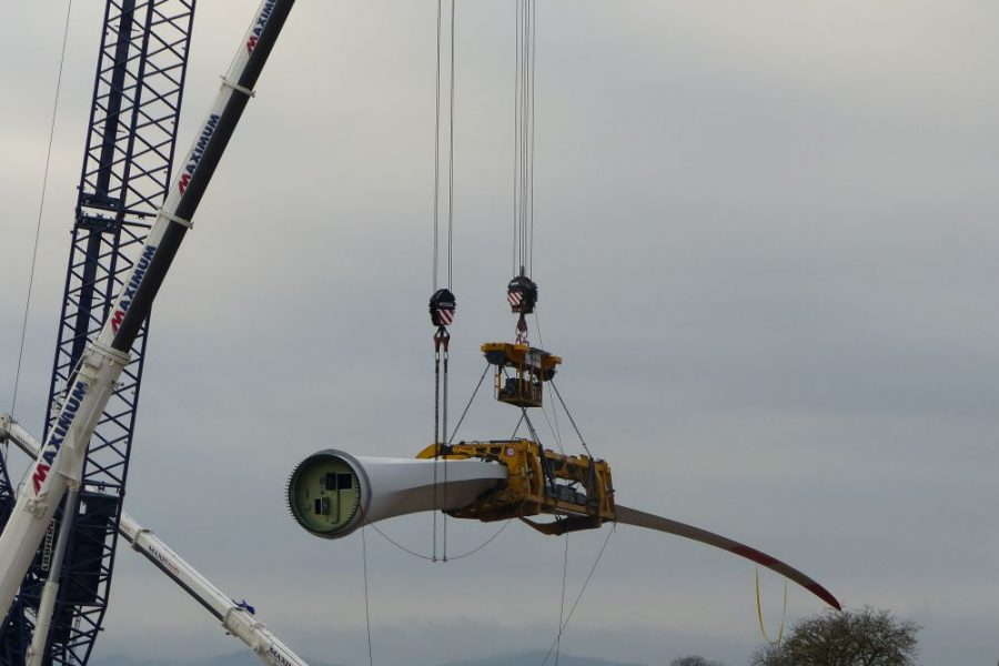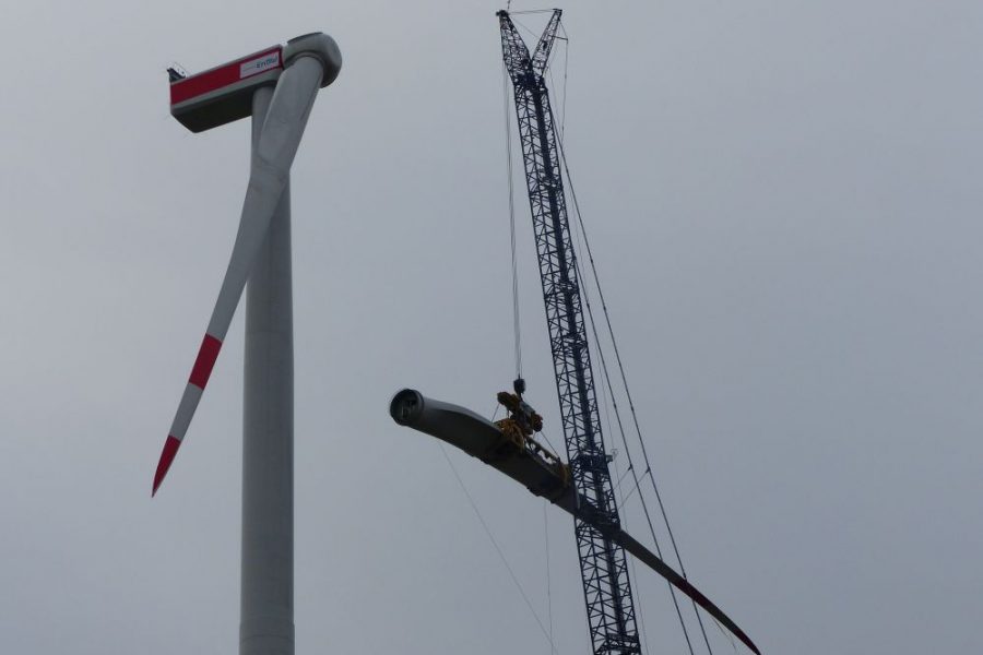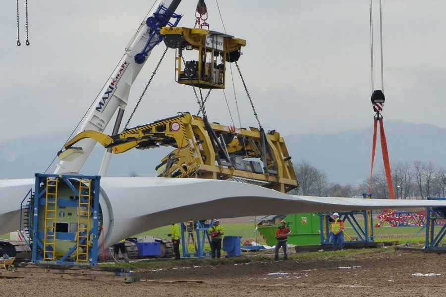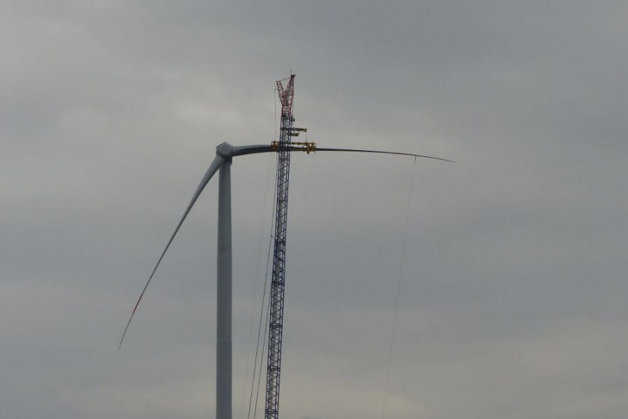 07.12.2017 Das erste Rotorblatt des Windparks ist montiert