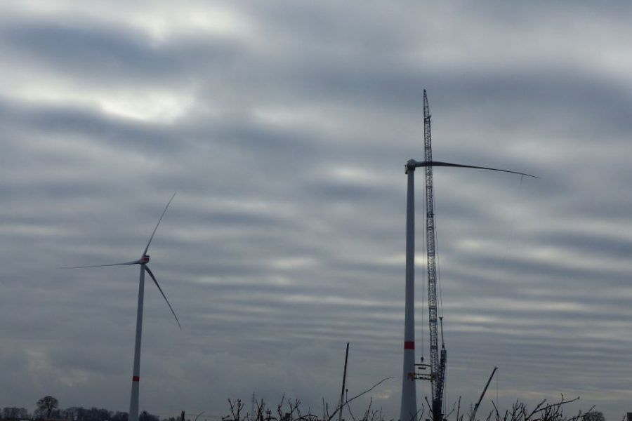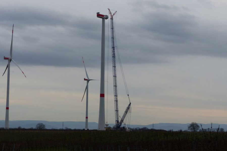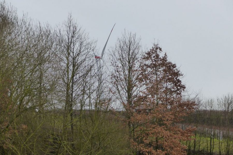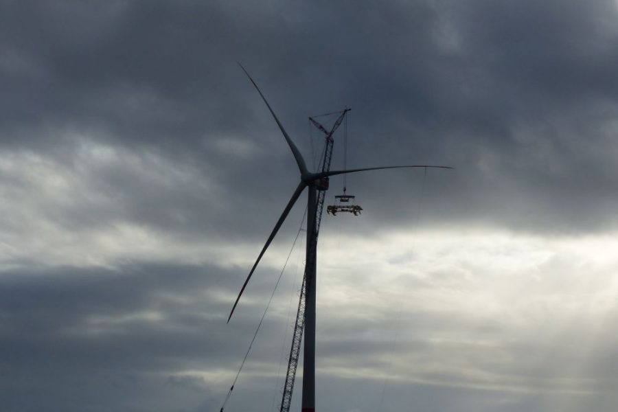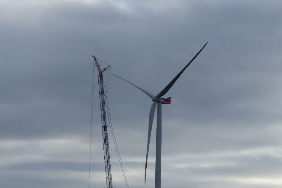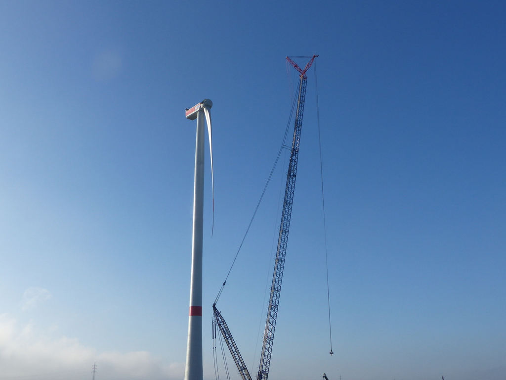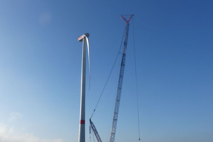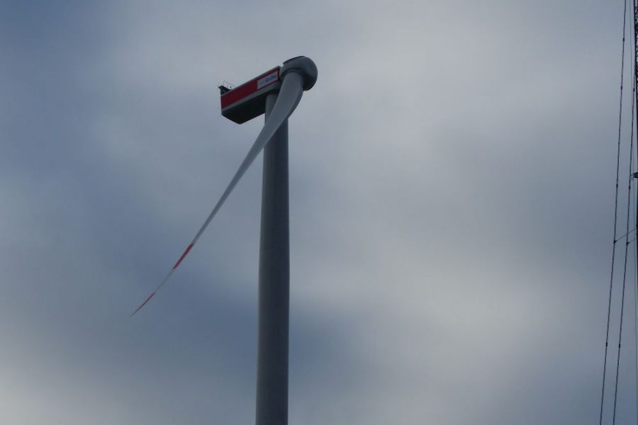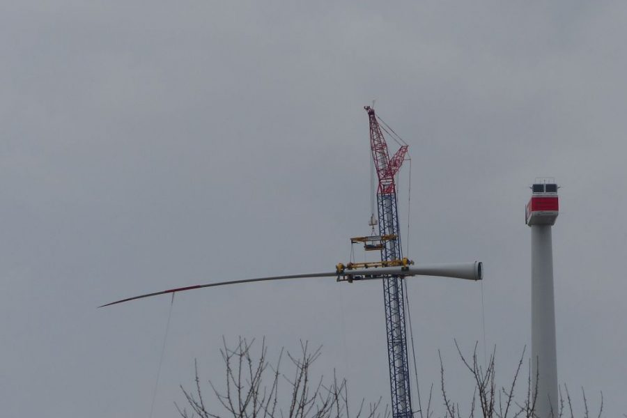 Jetzt ist es geschafft: Das zeitlich letzte Windrad des Windparks wurdeam 19.02.2018 fertig montiert. Der große Montagekran kann nun zur nächsten Baustelle gebracht werden. Es fehlt nun nur noch die Ankopplung an die Fernsteuerung und die Inbetriebnahme.