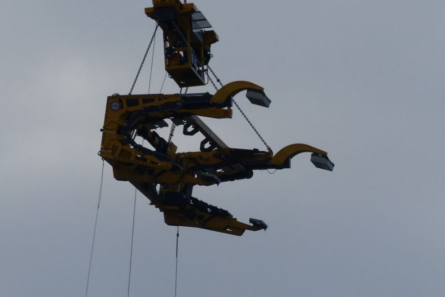 Ein weiterer Kran kommt auf die Baustelle, um die Spannseile, ein wesentliches Element des Spannbetonturms, zu montieren. Hier beim FRF06. Ich hatte mir die Spannseile vorgestellt wie ein Hubseil eines Krans (ca. 20mm Durchmesser) , doch weit gefehlt. Es sind vorgefertigte Stahlseilbündel (ca. 100mm Durchmesser) mit zwei Endstücken, die oben am Adaptersegment und unten im Fundamentkeller des Stahlbetonturms befestigt werden. Gut durchdacht von den Max-Boegl-Ingenieuren für eine schnelle Montage!