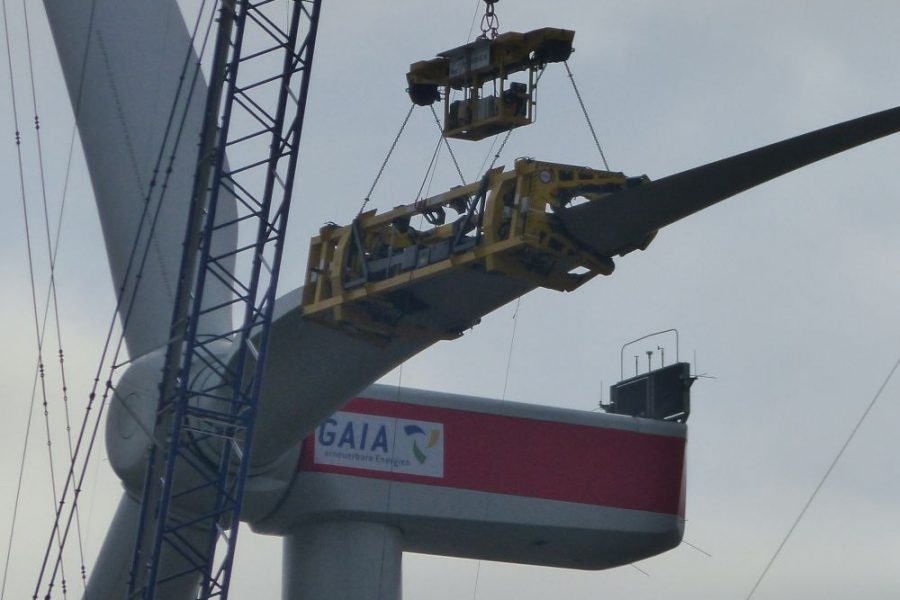 Spät am gestrigen Abend wurde das 1. Rotorblatt beim Windpark Freckenfeld (FRF06) montiert. Nun hängt es von den Windverhältnissen ab, wie zügig die Montage weitergeht, denn die Rotorblätter können, aus Sicherheitsgründen, nur bis zu einer Windstärke von 6 m/s hochgezogen und montiert werden.