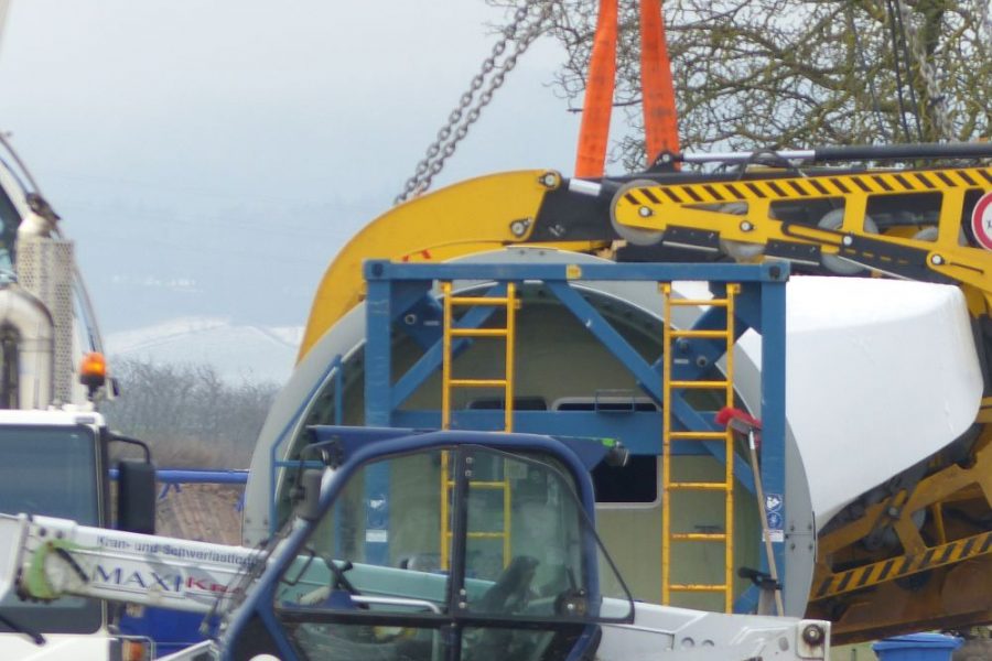 Die Montage des ersten Windrades geht in seine letzte und schwierigste Phase. Nachdem nun der große Kran, nach mehreren Tagen, heute komplett aufgestellt war, sollte das untere Stahlrohr montiert werden. Doch die Bodenfreiheit bei der Zufahrt war zu gering. Jetzt muss nochmal der Tiefbau ran. Morgen geht’s weiter.