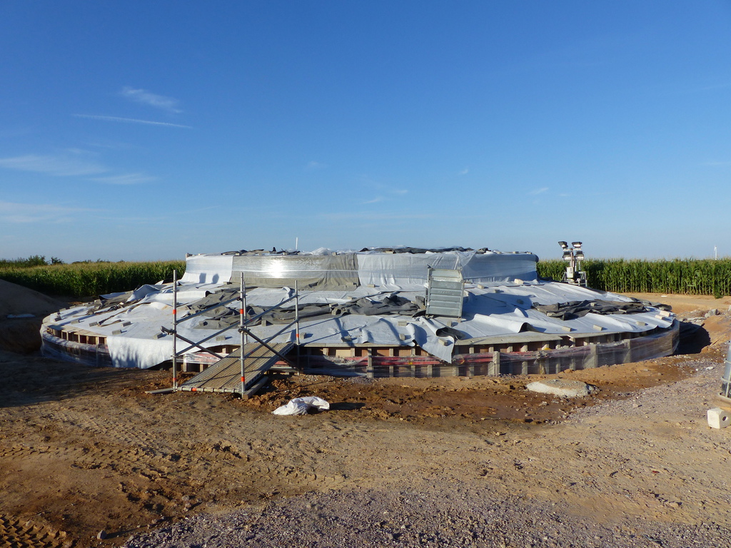 Heute wurde das 1. Fundament des Windparks Freckenfeld fertiggestellt. Schon am frühen Morgen, es war noch dunkel, fuhren die Betontransporter von 3 Betonwerken über den Feldweg (Leitnerweg) zwischen Barbelroth und Hergersweiler zur Baustelle. Die Betonbauer der Fa. Max Bögl aus der bayrischen Oberpfalz haben die mehr als 600m³ Beton fachgerecht eingebaut. Um die Mittagszeit war die Arbeit getan. Danach wurde das Fundament mit Planen abgedeckt, um es gegen die Sonneneinstrahlung zu schützen. Nun muss der Beton aushärten (ca. 4 Wochen), dann kommt der Turm. Die Arbeiten gehen nun reihum bei den anderen Windrädern weiter.